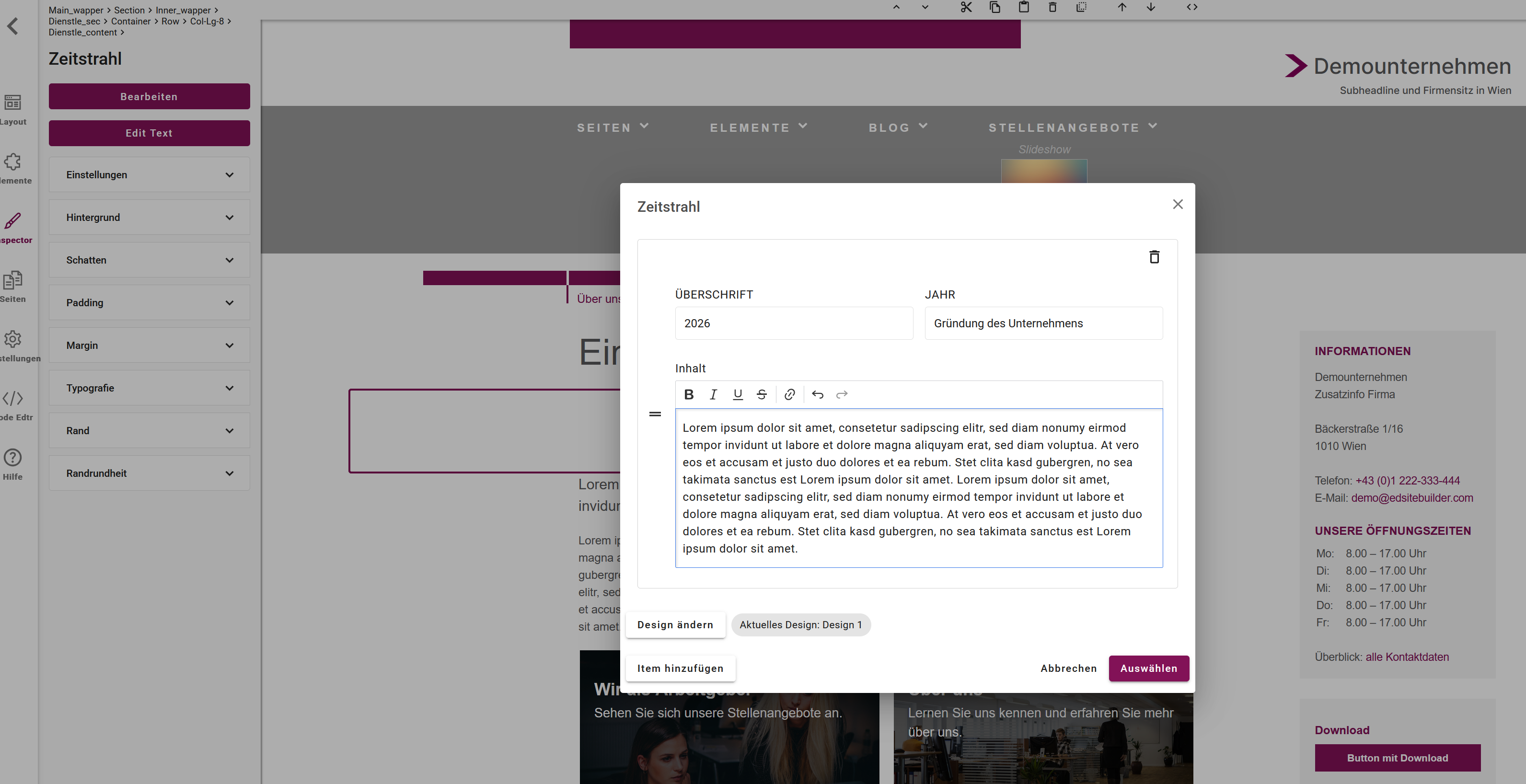 Mit dem Element „Zeitstrahl“ können Sie wichtige Ereignisse, Meilensteine oder Entwicklungen chronologisch auf Ihrer Webseite darstellen. Der Zeitstrahl eignet sich besonders gut für Unternehmenshistorien, Projektverläufe, Lebensläufe oder andere zeitlich strukturierte Inhalte.